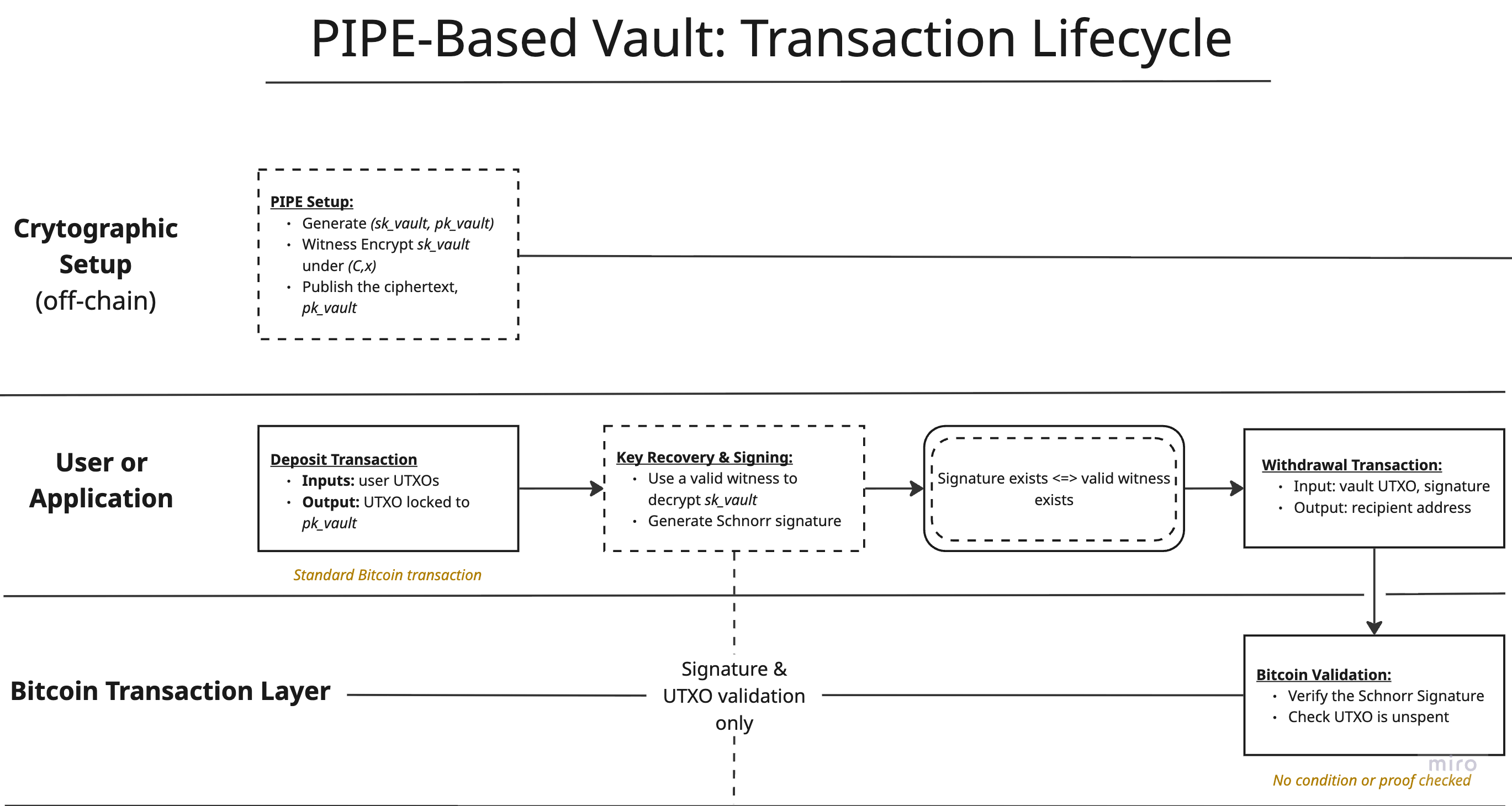 In a PIPE, the signing key corresponding to a Bitcoin address is not directly available. Instead, it is cryptographically locked behind a conditionâsuch as the existence of a valid zero-knowledge proof, an exit proof, or a fraud proof. If the condition is satisfied, the key can be recovered and used to produce an ordinary Schnorr signature. If the condition is not satisfied, producing a valid signature is computationally infeasible.