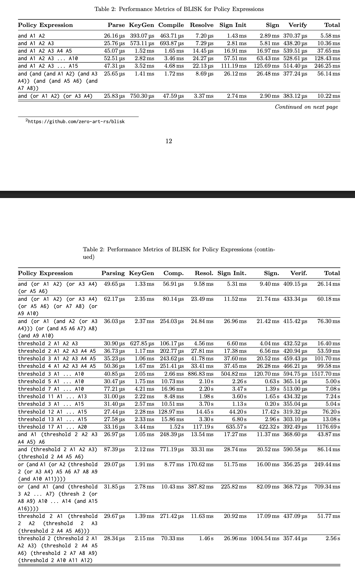 You can express policies that threshold signatures can’t capture faithfully, e.g. (A ∨ B) ∧ (C ∨ D) (structure, not just counting). Policies we have used for benchmarks are below: