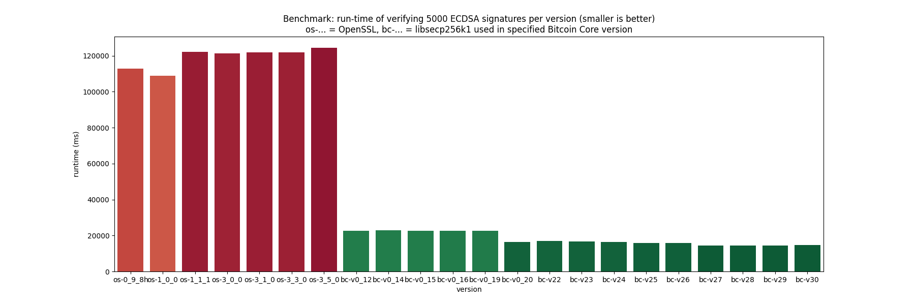 It’s clearly visible that in OpenSSL, the runtime for ECDSA signature verification on the curve secp256k1 hasn’t changed, while libsecp256k1 improved steadily, leading to an increasing performance gap over time between the two libraries.