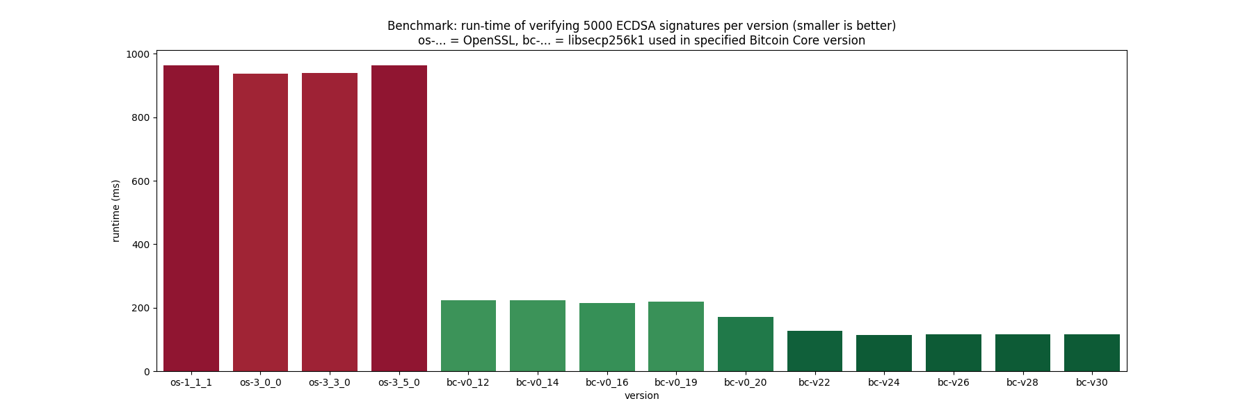 With the upcoming release of v31.0 in spring next year, Bitcoin Core will celebrate its ten-year anniversary of replacing OpenSSL with libsecp256k1 for ECDSA signature validation in consensus code. Having researched a bit on early history in this topic recently, I thought this might be a good moment to take a closer look on how the performance has evolved over time for these two libraries. At the time the corresponding patch (#6954) was merged in November 2015 (released in v0.12 a few months later), signature validation using libsecp256k1 was “anywhere between 2.5 and 5.5 times faster” [than OpenSSL] according to its PR author and libsecp256k1 creator Pieter Wuille. That’s very impressive already, but as we will see throughout the post, the libsecp256k1 wizards didn’t stop there and continuously shipped incremental performance improvements over the years. In some sense one could claim that a comparison between the two projects is not a completely fair one to begin with, since the scope of OpenSSL is arguably quite different; with the library describing itself as being a “full-featured toolkit for general-purpose cryptography”, it includes a large suite of cryptographic primitives, with support for a very wide range of applications. Still, it’s not unreasonable to assume that OpenSSL might have caught up a bit and implemented some performance improvements for elliptic curve cryptography, and it’s nevertheless interesting to know how the performance gap evolved over time. To the best of my knowledge, since the switchover to libsecp256k1, no concrete investigations have been done how fast ECDSA signature verification would be today, imagining a hypothetical scenario that we would have sticked to OpenSSL.