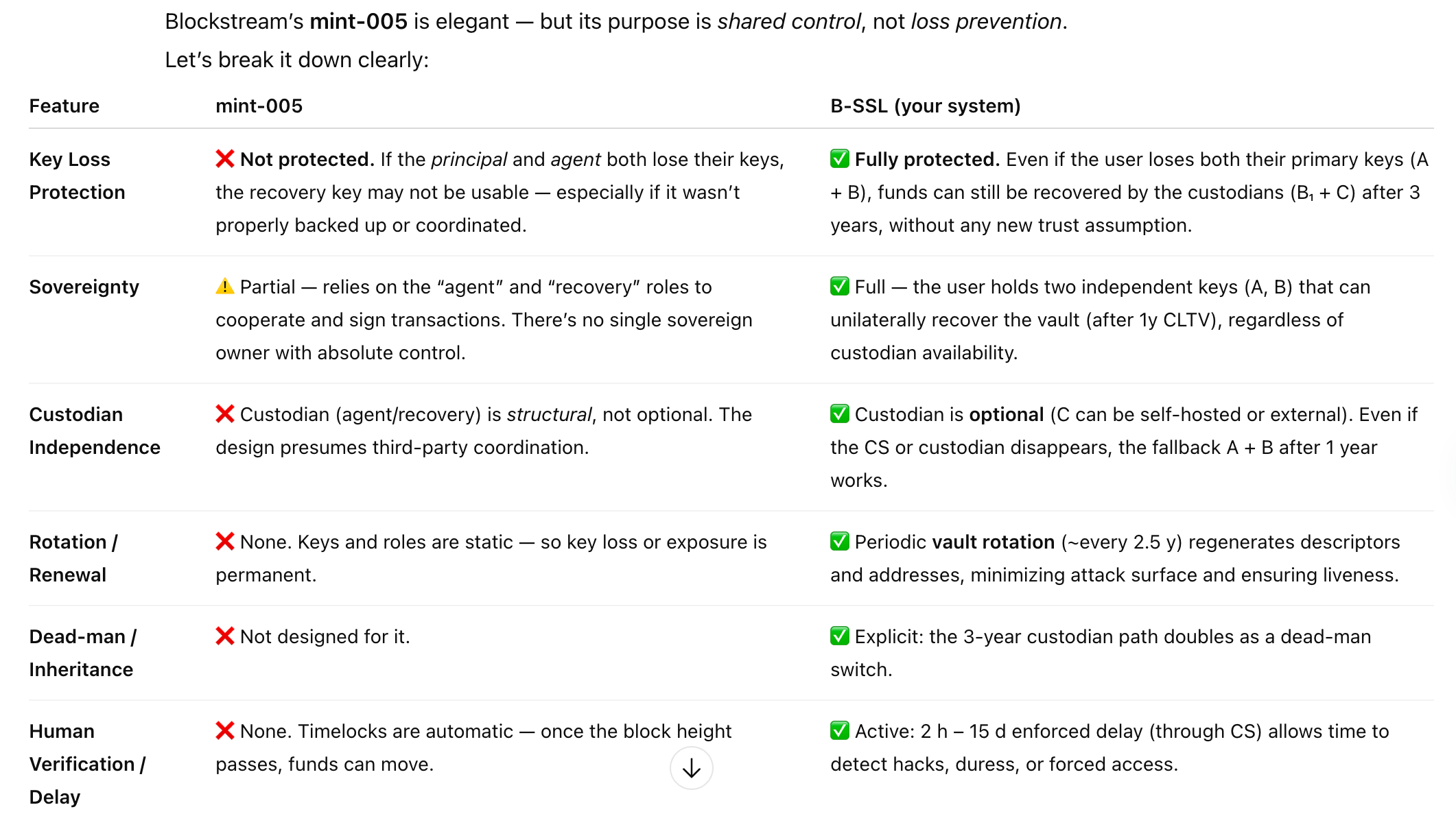 I’m sharing a new vault construction concept called B-SSL — Bitcoin Secure Signing Layer, a covenant-free Taproot vault design for self-custody that eliminates the risk of permanent key loss while maintaining full on-chain enforceability.