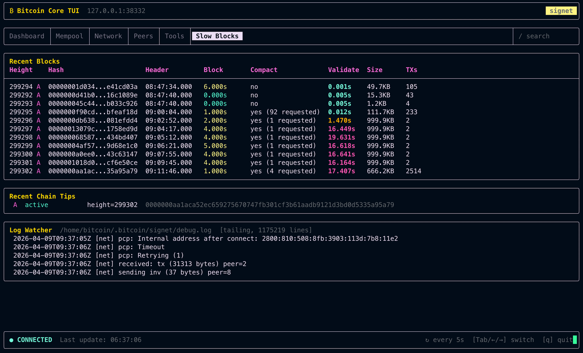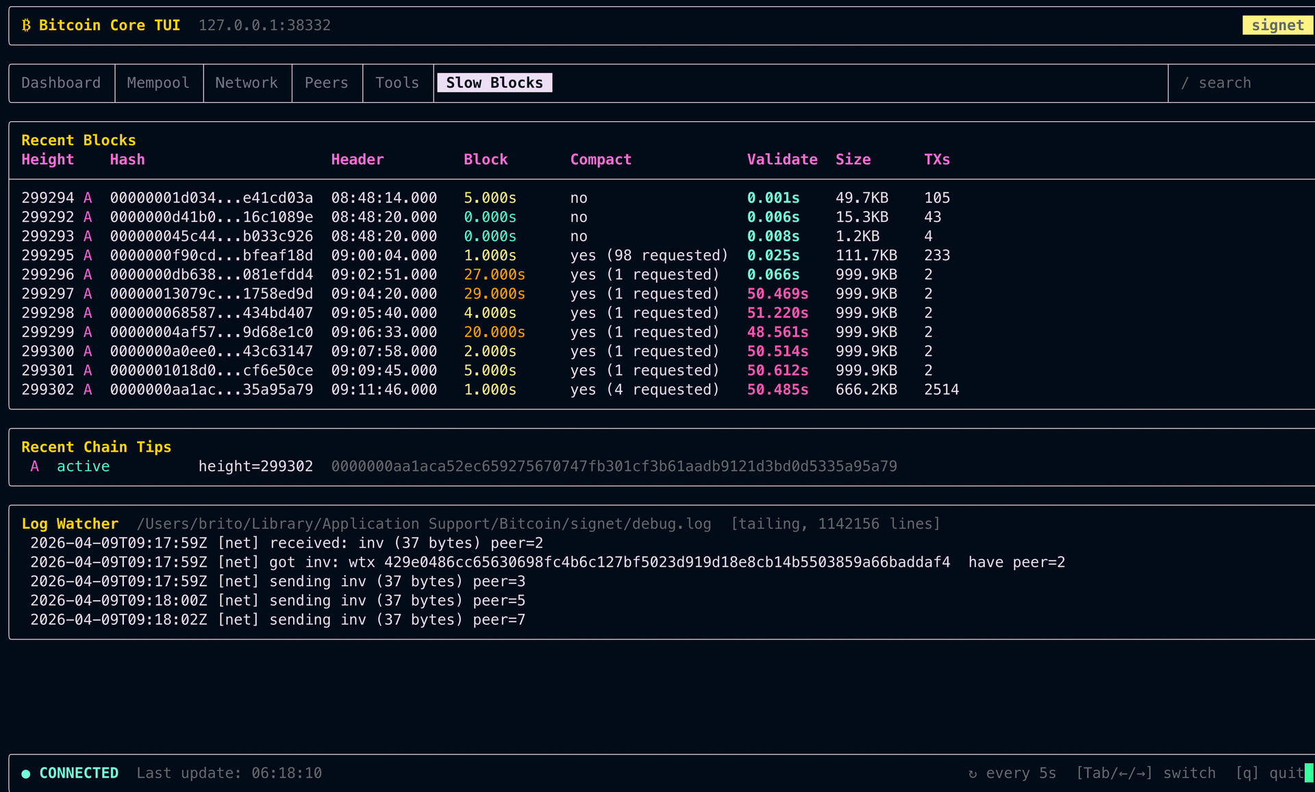 2026-04-09T09:13:03.386162Z [msghand] [bench] - Connect block: 424.65ms [1502.02s (9271.73ms/blk)]