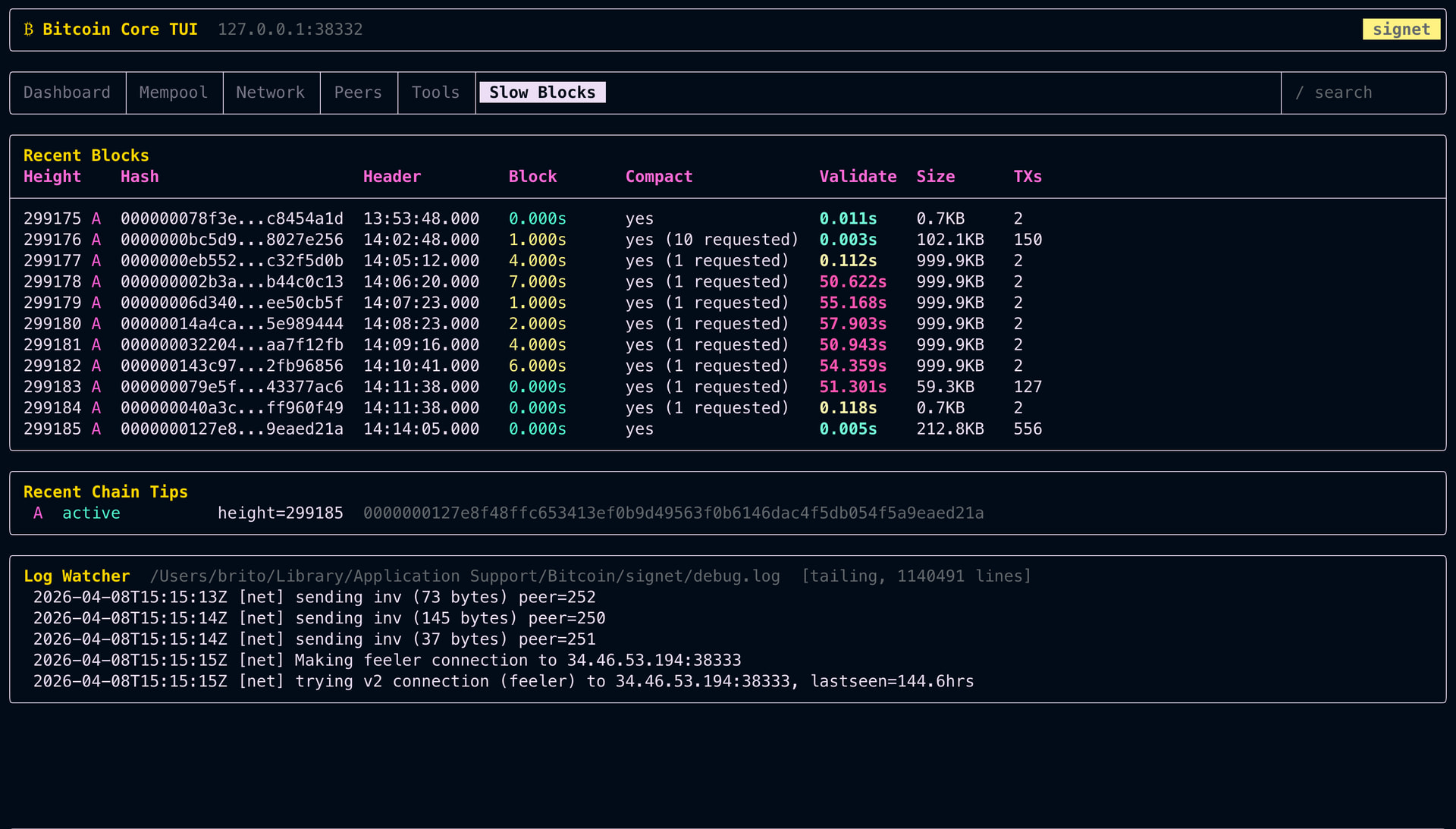 2026-04-08 14:23:10.134 [DBG] SYNC: processed block 299179 00000006d34037534a517f9e5809a34766f1540c0e6817eac91b1adfee50cb5f in 357992482187ns