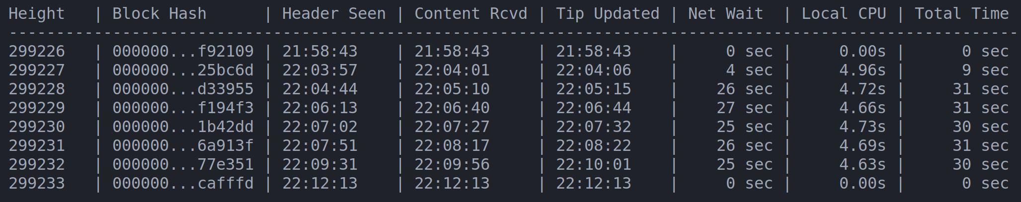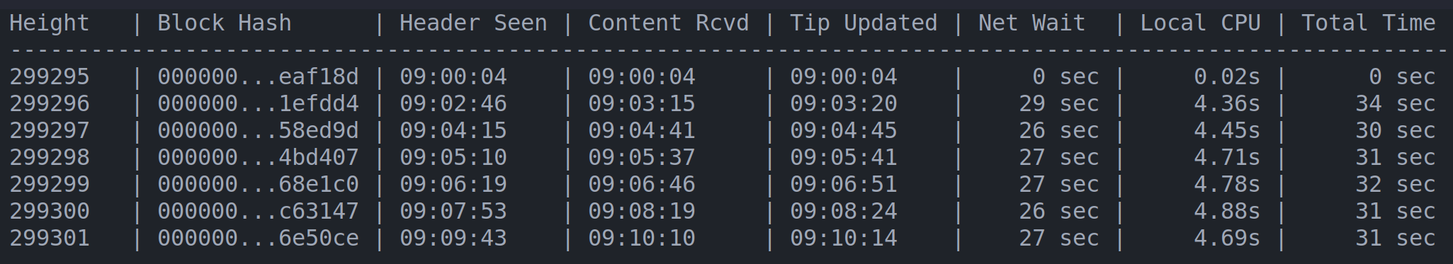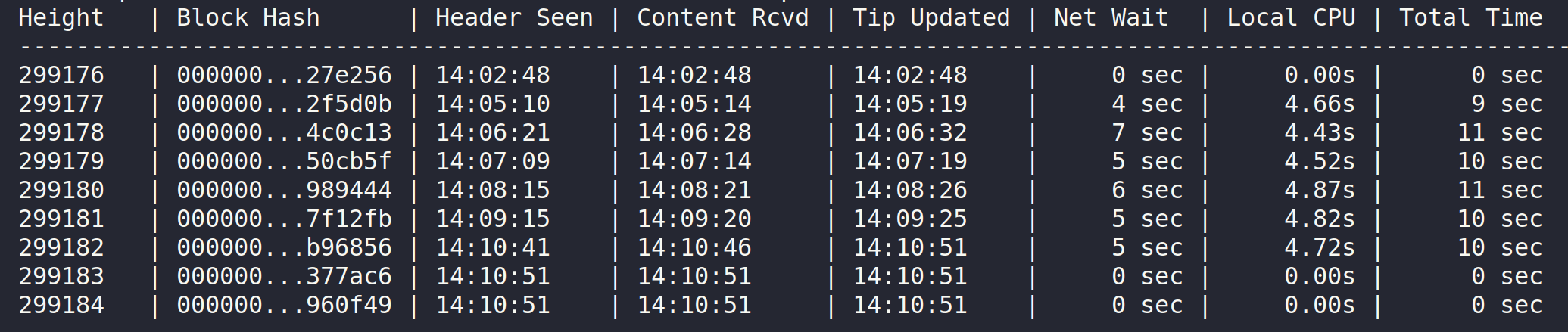 | block hash | delay (seconds) |