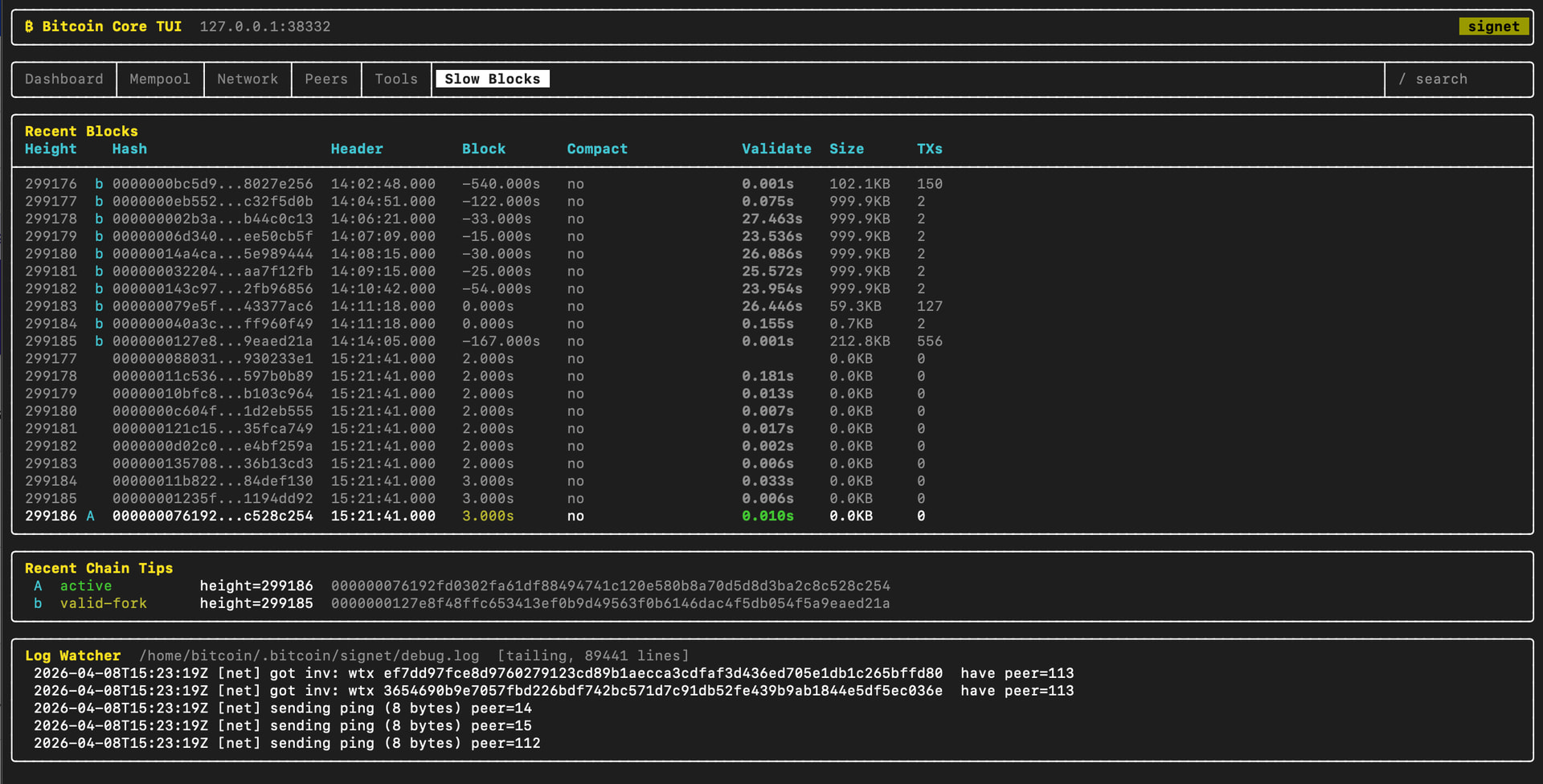 2026-04-08 14:11:10.466 [DBG] SYNC: processed block 299177 0000000eb552c9f26e712d546c71297fd0623890299b40e7ada81d2dc32f5d0b in 352245323324ns