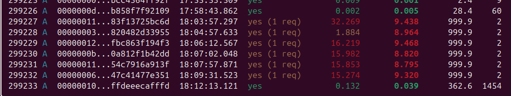 Here is for each block the delay between my node first saw the block hash and when it finally received the block content.