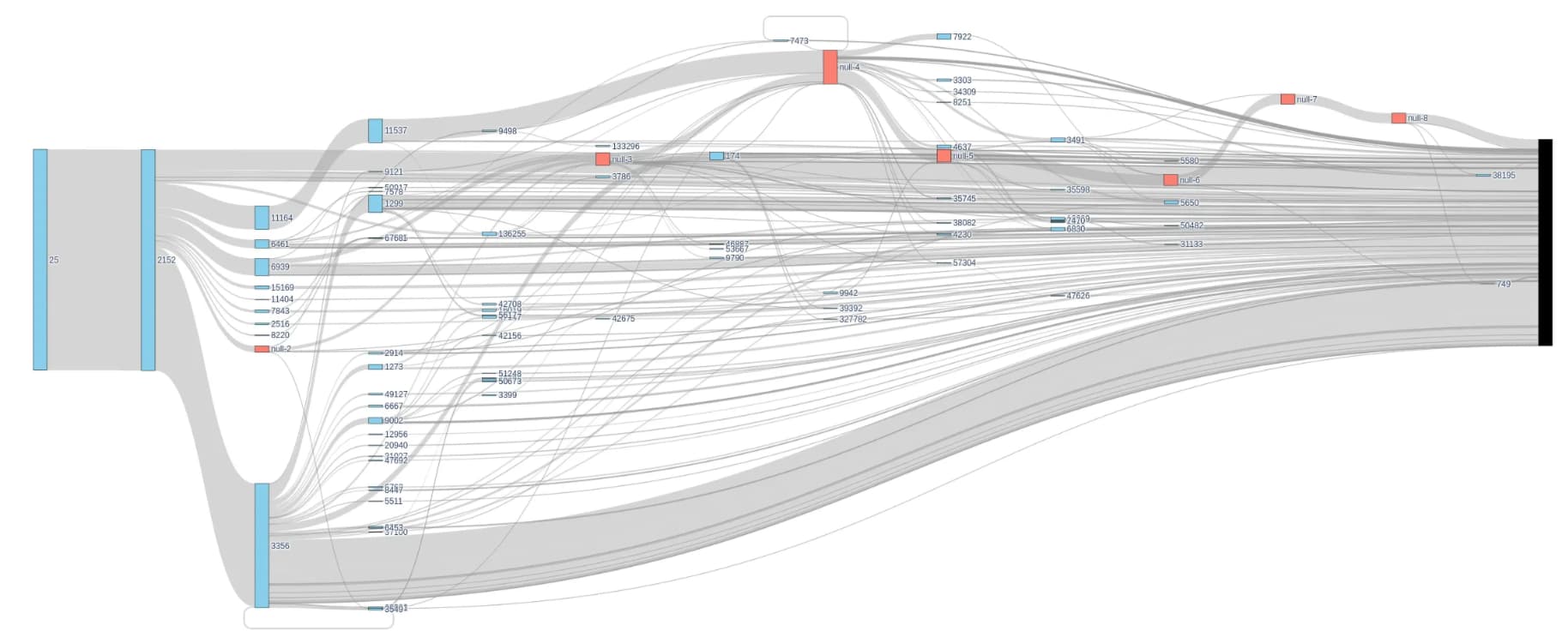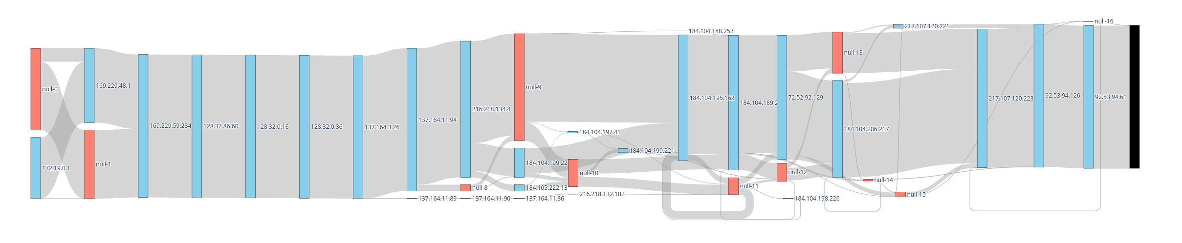 This is illustrated in the sankey diagram below that samples traffic to all 350 nodes and aggregates all destinations and terminal null traceroute hops in the block on the right. All traffic initially flows from AS 25 to 2152 before being it gets split over a set of ASes on the 3rd hop, and then an even larger set on the 4th hop.