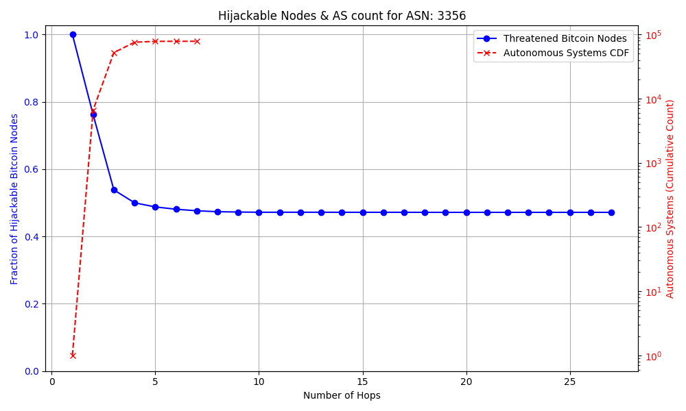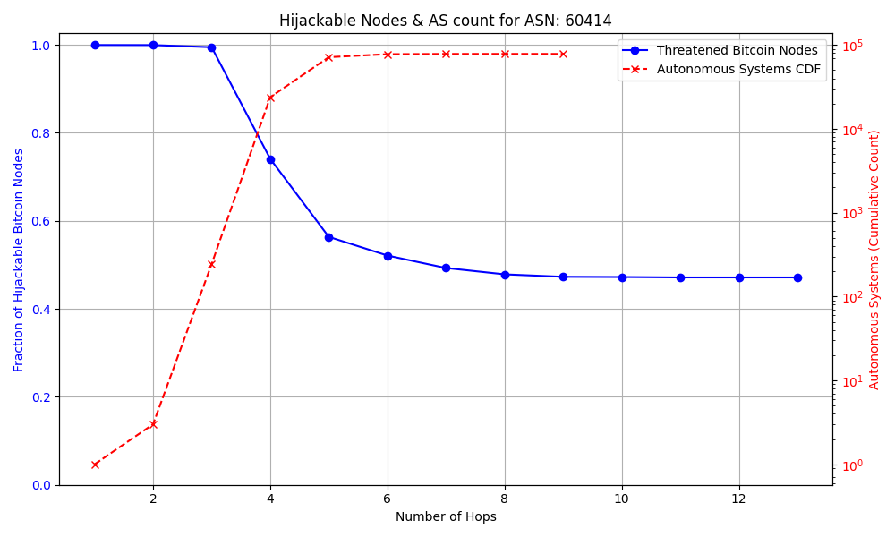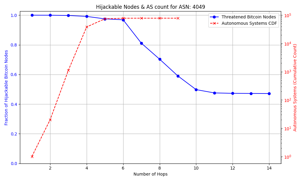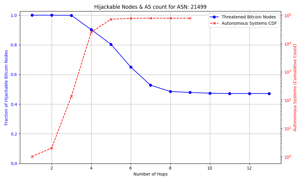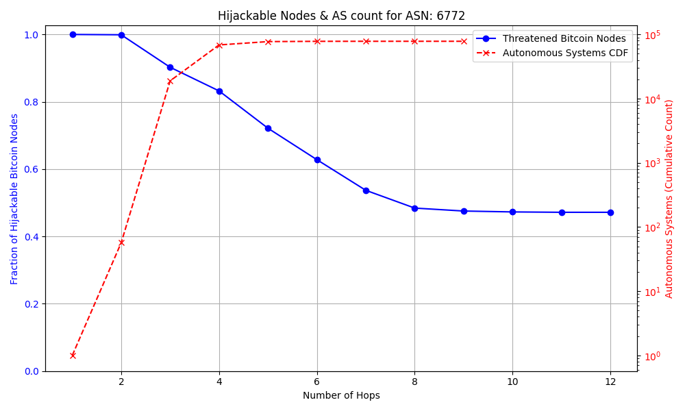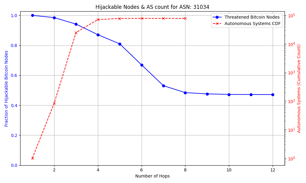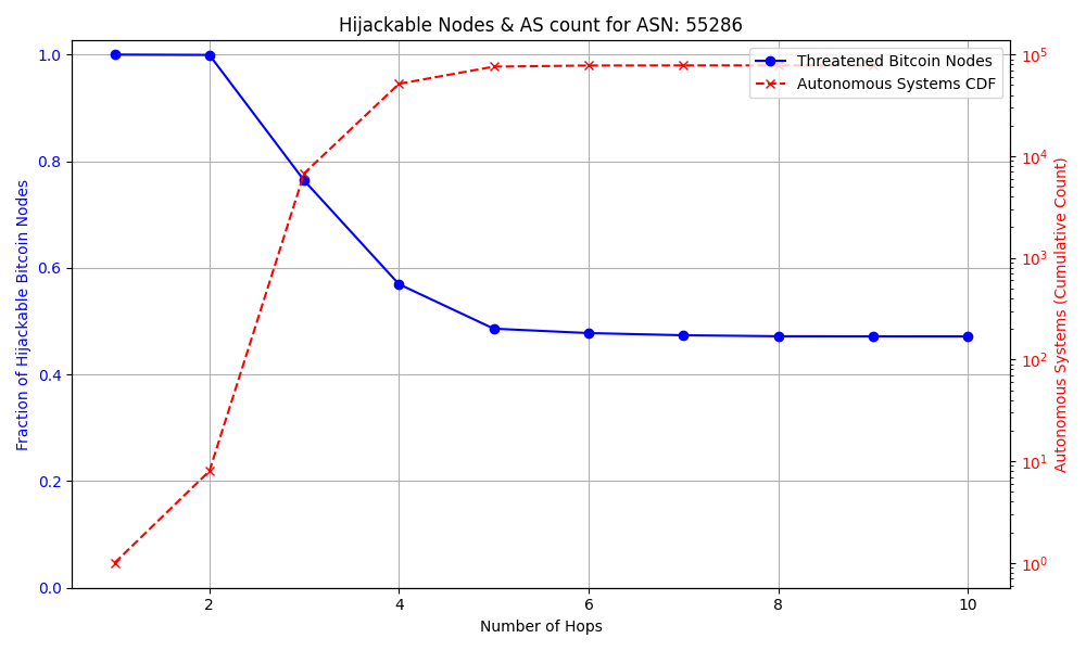 The success rate and feasibility of the attack depends on the victim. The figure below quantifies this for a victim node in AS 31034. The x axis represents the number of hops away (in number of ASes) that the adversary AS is from the victim AS. The y axis shows the number of Bitcoin nodes that the adversary intercepts in blue, and in red the number of ASes that exist up to that number of hops away from the victim AS which the attacker can potentially compromise. For instance, an attacker can compromise one of 10,000+ ASes that are 3 or fewer hops away from the victim, and successfully hijack connections to over 85% of reachable nodes.
