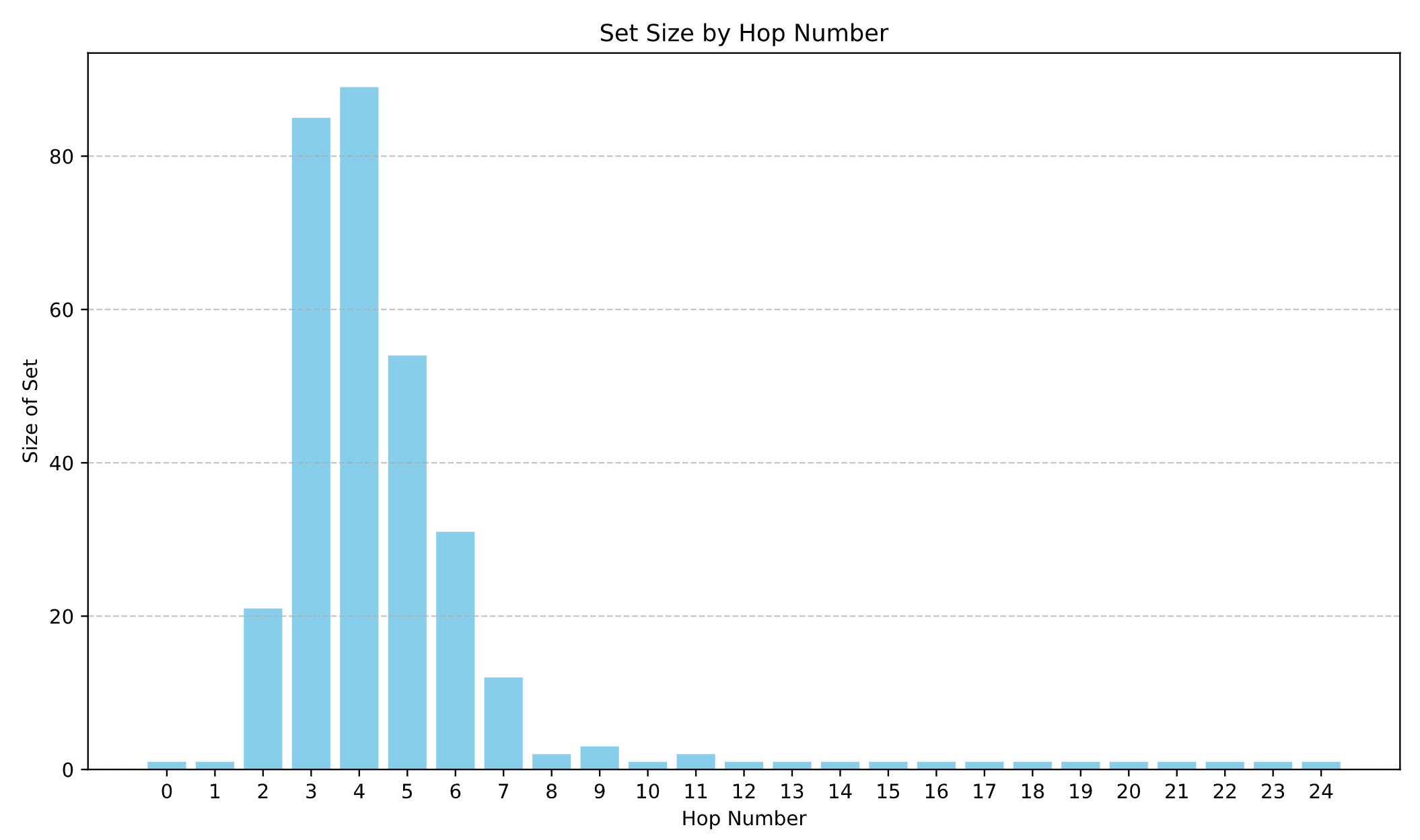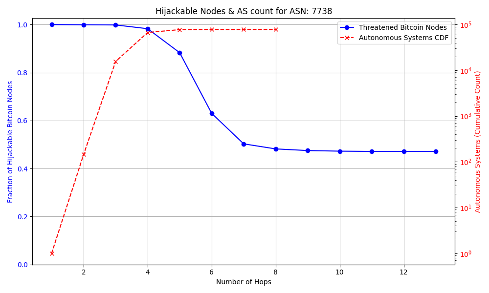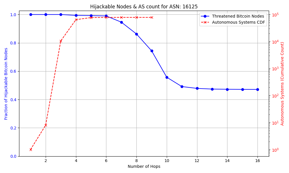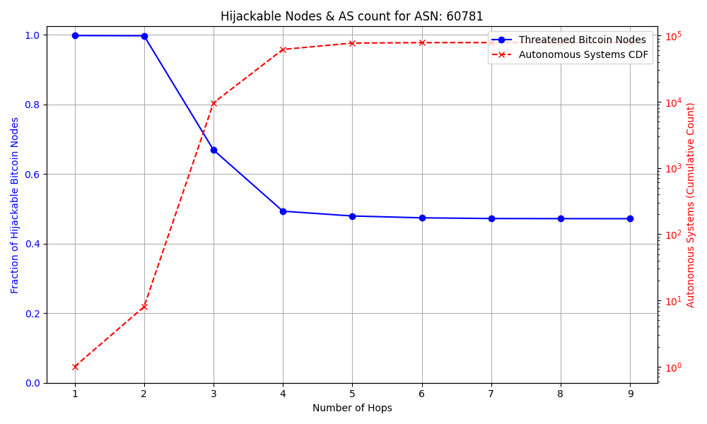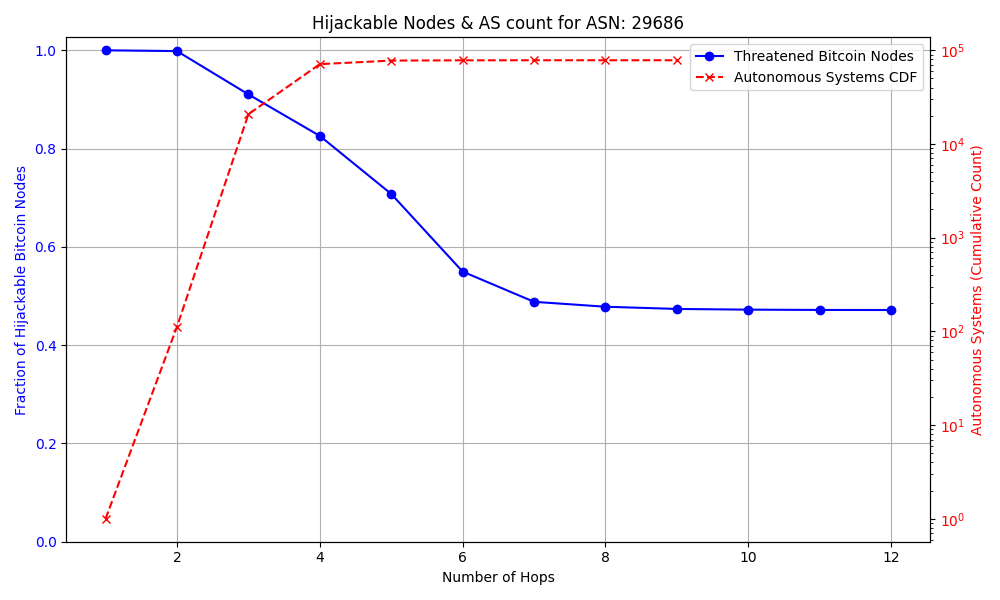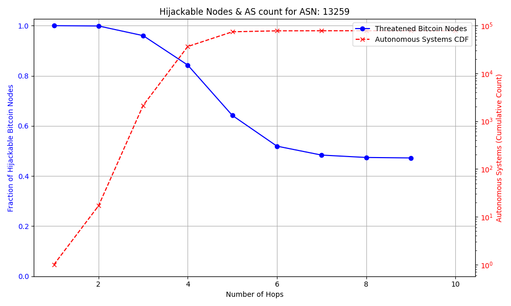 The success rate and feasibility of the attack depends on the victim. The figure below quantifies this for a victim node in AS 31034. The x axis represents the number of hops away (in number of ASes) that the adversary AS is from the victim AS. The y axis shows the number of Bitcoin nodes that the adversary intercepts in blue, and in red the number of ASes that exist up to that number of hops away from the victim AS which the attacker can potentially compromise. For instance, an attacker can compromise one of 10,000+ ASes that are 3 or fewer hops away from the victim, and successfully hijack connections to over 85% of reachable nodes.