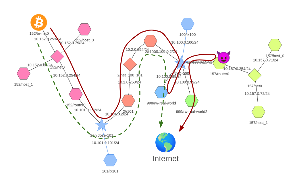 To confirm the feasibility of the attack I emulated a simple AS topology with gateways to the real internet, and eclipsed my own Bitcoin node that was connected to the mainnet. This topology is illustrated in the figure below along with the path that traffic took before and after the attack.