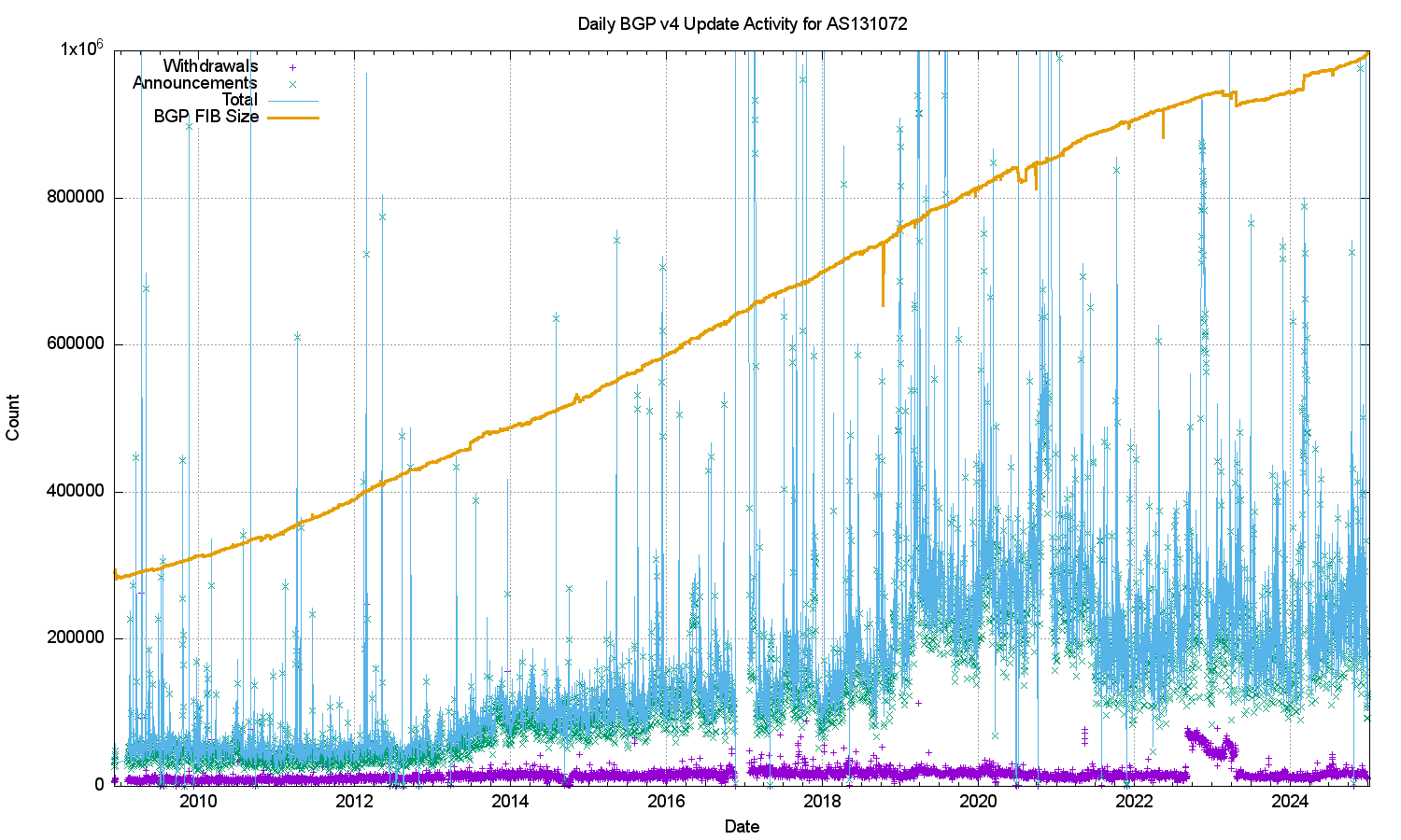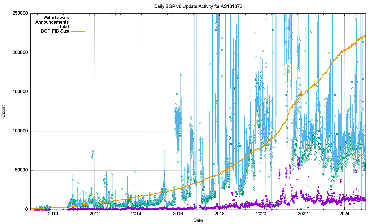 Graphs: Number of BGP route announcements and withdrawals for IPv4 and IPv6 prefixes as observed by a vantage point. Source: Geoff Huston - ISP Column - January 2025