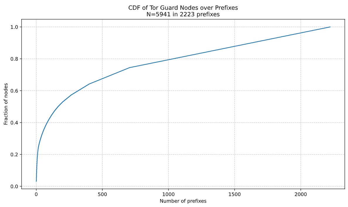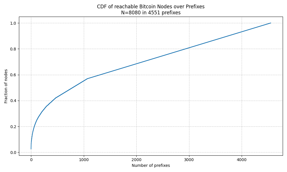Using a snapshot from Bitnodes we can see that all reachable nodes reside in just 4551 prefixes (the internet has over 1,155,000 allocated prefixes). Furthermore, the attacker can cover more than ~55% of reachable nodes by hijacking just 1000 prefixes.