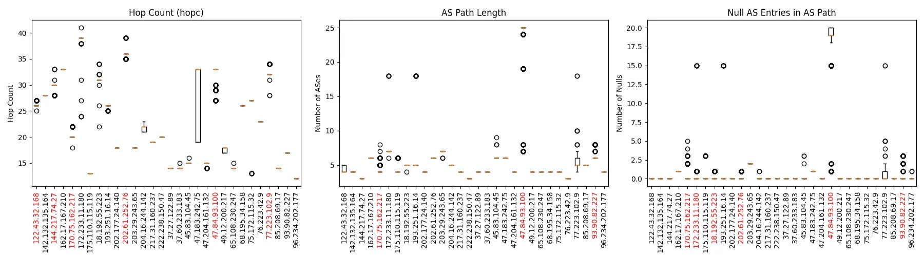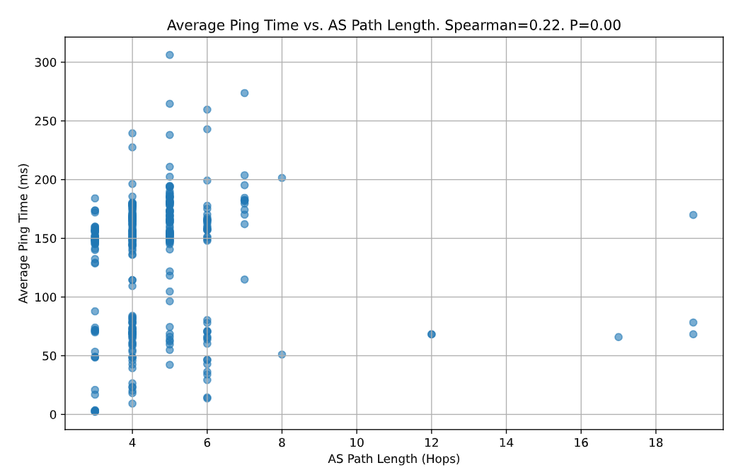This is also visualized in the following histogram that shows the number of unique ASes that traffic crosses at a given hop count. After the 4th hop, the number of unique available ASes decreases because most traffic has already reached its destination AS. ASes at hop counts > 8 are mostly artifacts of terminating null hops in our traceroutes (e.g “null_15”).