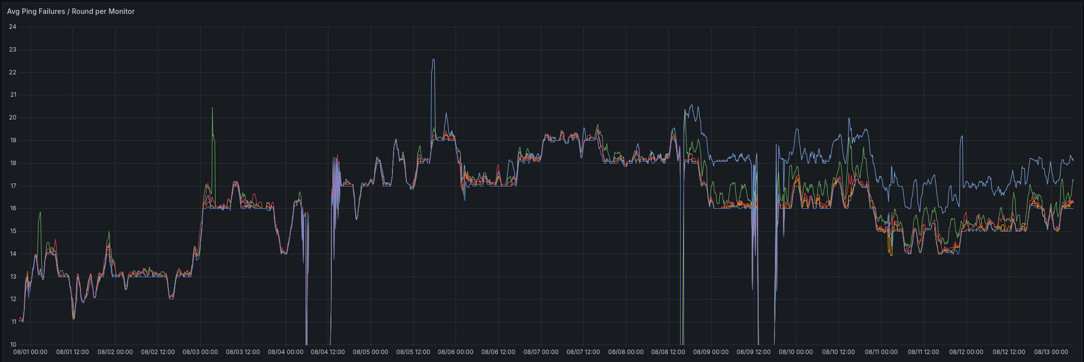 Over the past month, the number of nodes that could not be reached using ICMP pings has increased from 4 to 15-18 in the sample set of 350 reachable nodes.