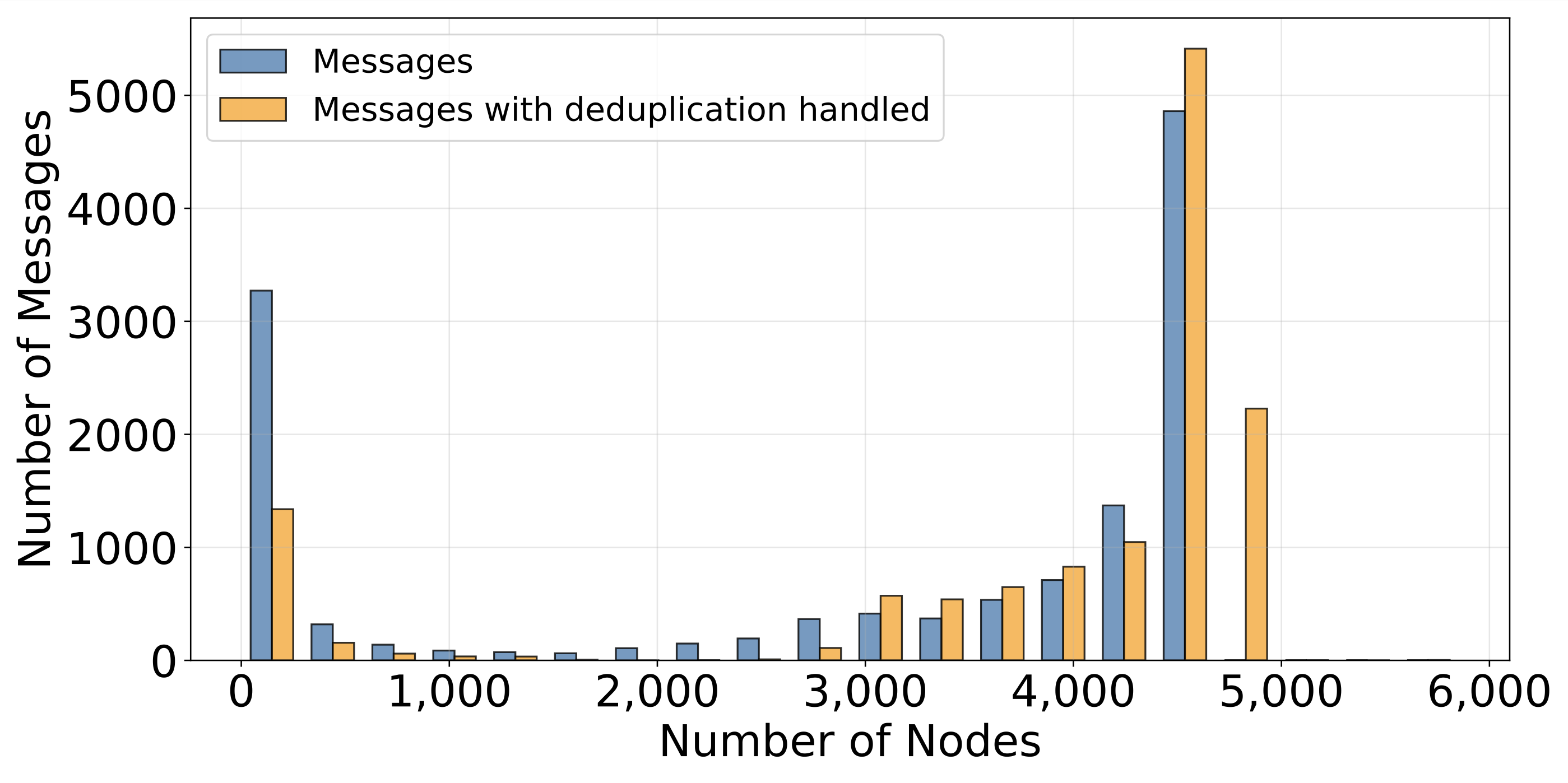 Another influence I looked at (plotted as “with deduplication”) is the staggered broadcast mechanism, where a node shall only forward a gossip message with the greatest known timestamp field. As this is one mechanism, where messages could be dropped, I changed the methodology to consider a node “receiving” a message when forwarding message m, or any of its successors m’ (where timestamp field of m’ is greater than that of m) to the gossip observer node. That further changes the results to what would be expected from the network: That every one of the ~4,500 connected nodes received each message. Though I cannot explain why there are so many messages in the 0–500 node range on the left that, apparently, starve.