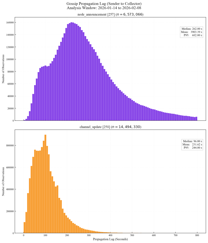 I run two Core Lightning nodes (Alice and Bob) in default configuration, meaning ~10 peers to receive gossip from. Every gossip messages that is appended to the gossip_store file gets timestamped and saved in a database.