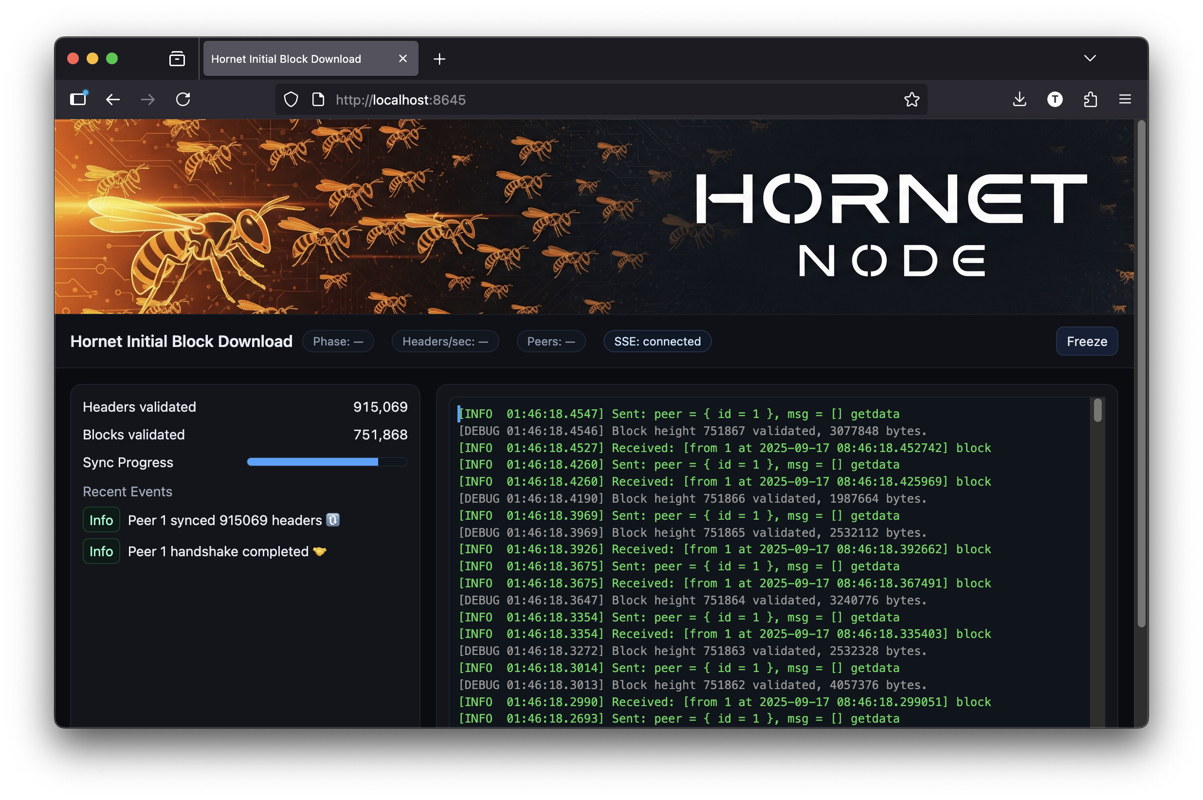 Hornet Node performing IBD and displaying status info in a browser window.