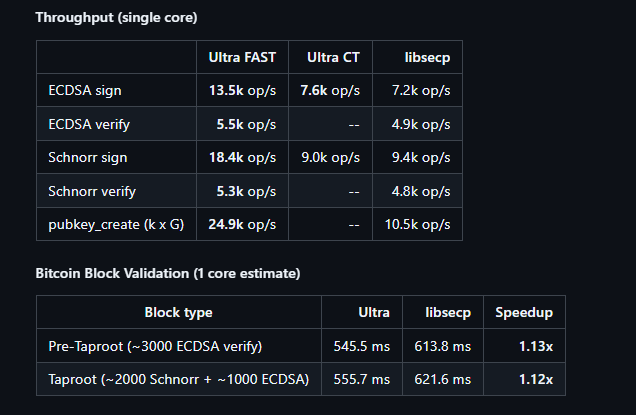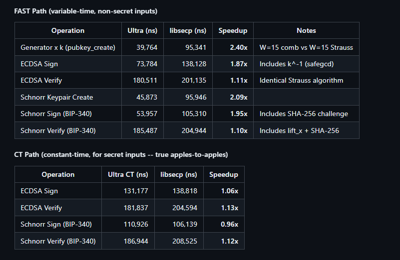 Hello everyone. I’ve been developing a high-throughput implementation called UltrafastSecp256k1. The project, which was open-sourced on February 11th, 2026, started as an exploration of how modern hardware features (SHA-NI, AVX2, ARM64 Assembly) can be leveraged to push the limits of ECC performance across diverse platforms—from high-end x86 servers to resource-constrained IoT devices like ESP32-S3 and RISC-V boards.