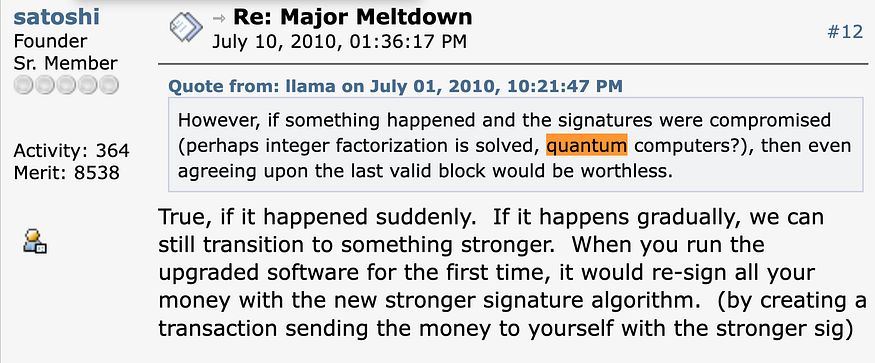Satoshi was also explicitly aware of quantum computing as a future threat to public-key cryptography, and addressed it directly rather than dismissing it. In discussing quantum computers, he wrote: