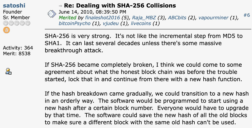 Taken together, these comments show that Bitcoin’s cryptographic assumptions were never meant to be permanent. Both hashing algorithms and signature schemes were understood by Satoshi as replaceable components, with the expectation that advances — whether classical or quantum — would eventually require adaptation.