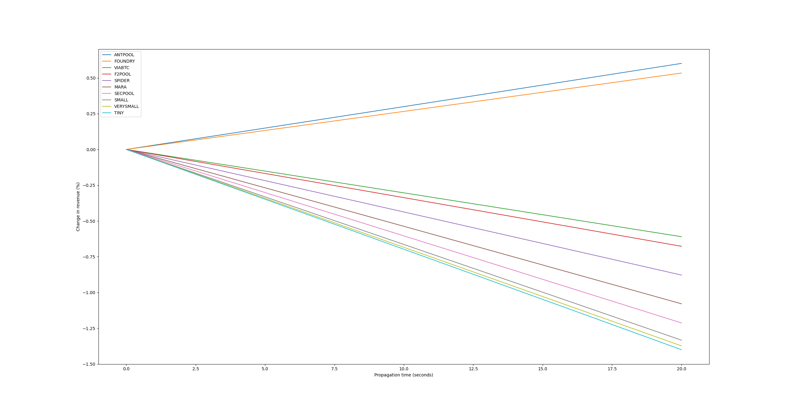 A few months ago i posted a detailed analysis of Selfish Mining. “Selfish” Mining is a strategy whereby a sufficiently large minority miner can maximize its revenues by selectively publishing blocks. While it’s interesting to consider what is the optimal strategy a miner could adopt in this simplified model, i think it’s primarily interesting in demonstrating the considerable extent to which longer block propagation times advantage larger miners. Following up on this, i looked into how propagation time affects a miner’s revenue as a function of its hashrate.