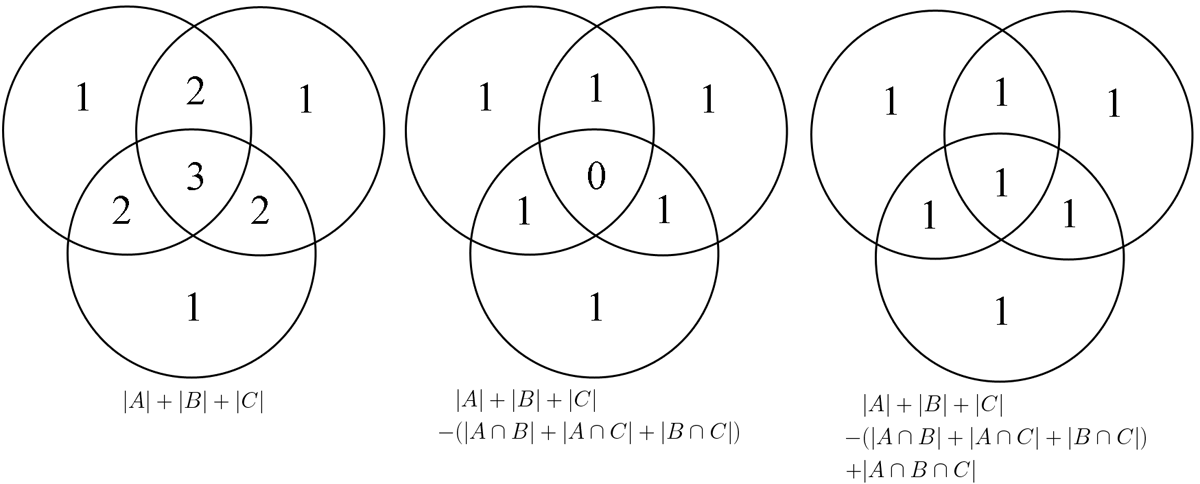 But, we undercounted, since |A|+|B|+|C| counts the events in A\cap B\cap C three times, but |A\cap B|+|A\cap C|+|B\cap C| also counts them three times since any event in all three is in any two, so we have to add them back…